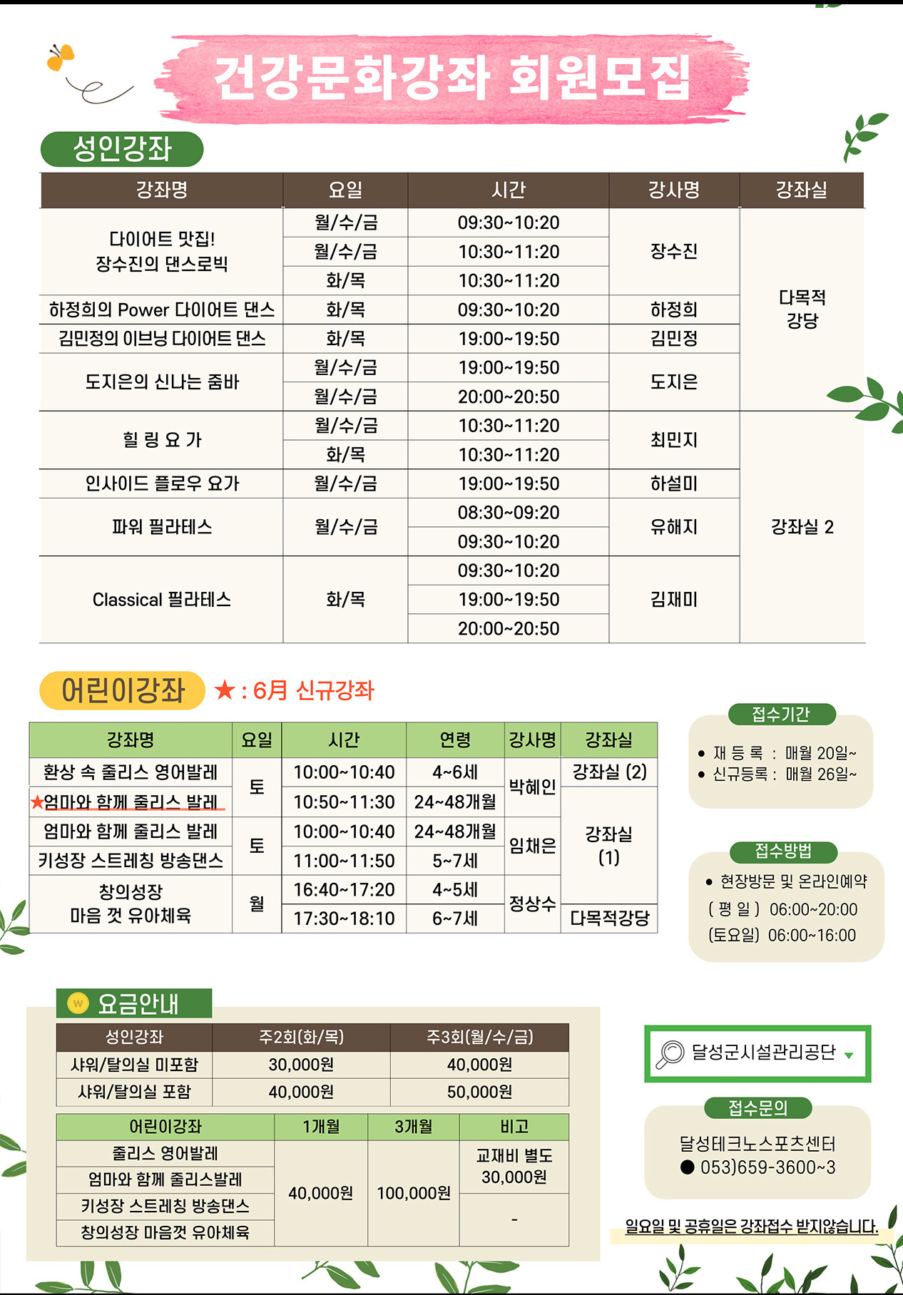※ 건강강좌의 경우 (샤워실 및 탈의실 포함) 강좌료의 경우 방문하시어 안내데스트에서 접수바랍니다.